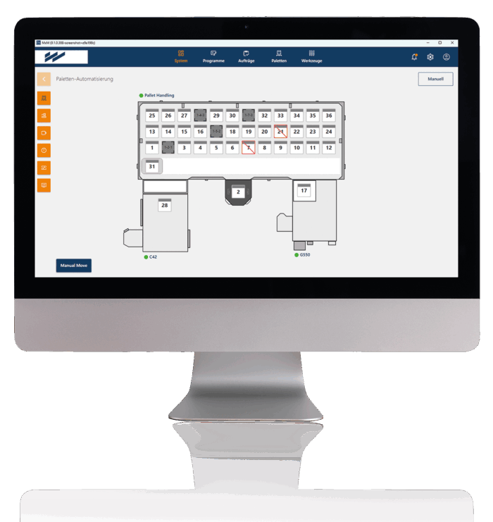Die WASSERMANN-eigene Zellensteuerung an den TERMINALs, alternativ von PROCAM, SOFLEX oder EVOMECS unterstützt den Bediener bei der Werkzeug- bzw. Werkstückverwaltung. Hierfür gibt es ein separates Bedienfeld in Touch Screen Ausführung – alternativ kann man das jeweilige Zustellmagazin auch über die Maschinensteuerung mit verwalten.